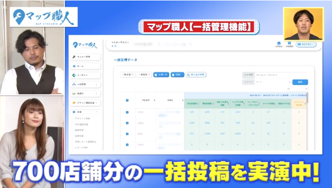 マップ職人はGoogleマップの一括管理ツールで、店舗情報や投稿、自動復元機能など一元管理と業務効率化が図れます。また、クチコミのネガポジ判定から、一括返信、定型文設定、データダウンロードまで対応しています。さらに、Google APIの正確な順位情報で計測半径や計測時間の設定にも対応することができます。