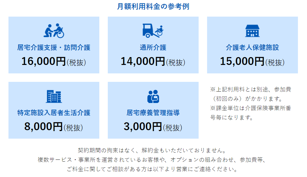 本サービスの料金は、事業所番号ごとの参加費(初回のみ)と月額利用料です。料金はサービスの種類・組み合わせによって異なりますので個別にお見積もりいたします。お気軽にお問合せください。