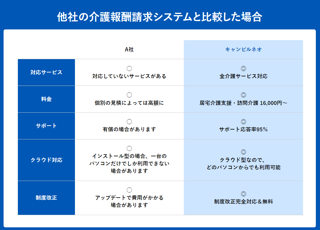 キャンビルネオは、介護事業に必要な請求・伝送に加え、業務、経営の面でも利用できる、クラウド型のサービスです。いつでも、どこからでも、何台からでもアクセスができて、簡単に入力、伝送、管理を行えます。