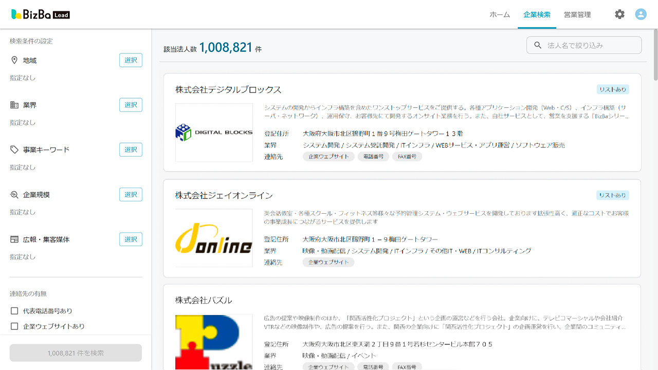 日本法人約100万件のデータベースから新規顧客リストがたった10秒で作成可能!KPI分析で営業活動の改善点が特定できるため、PDCAを高速で回すことができ、貴社独自の勝ち筋を見つけることができます。
