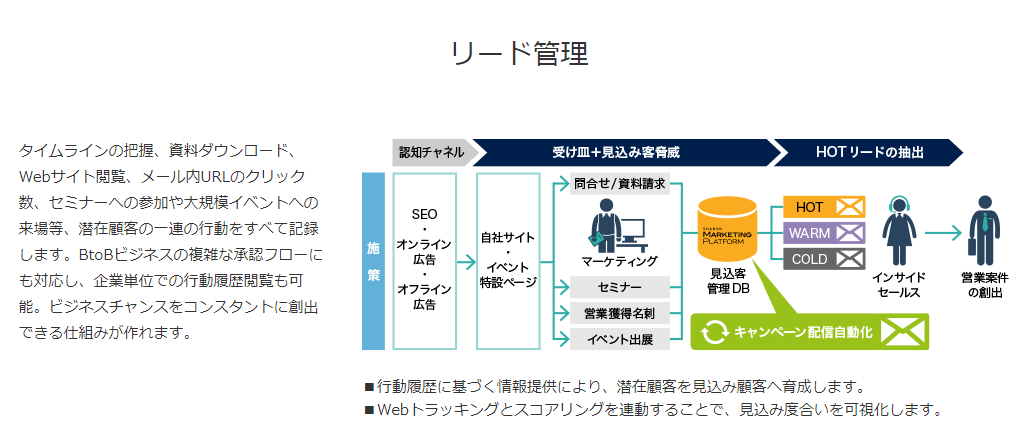 「SHANON MARKETING PLATFORM」は、リードの獲得から買う気の引き上げまでを一気通貫で実施できるよう支援します。
