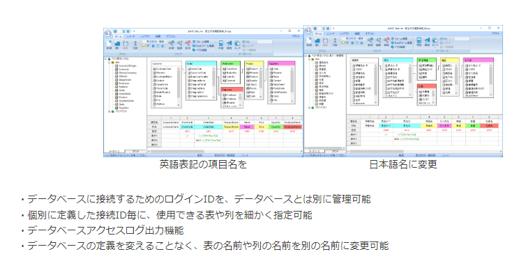 別名登録機能を使うことで、例えば、システムでつけられている英語表記の項目名を使い慣れた名称に変更して使用することが可能となります。これはSkyLink独自の管理によるものなのでデータベースの設定を変更することなく行うことができます。