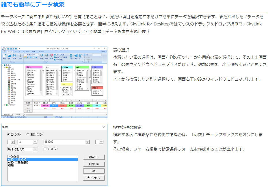 データベースに関する知識や難しいSQLを覚えることなく、見たい項目を指定するだけで簡単にデータを選択できます。また抽出したいデータを絞り込むための条件指定も複雑な操作を必要とせず、簡単に行えます。SkyLink for Desktopではマウスのドラッグ&ドロップ操作で、SkyLink for Webでは必要な項目をクリックしていくことで簡単にデータ検索を実現します。