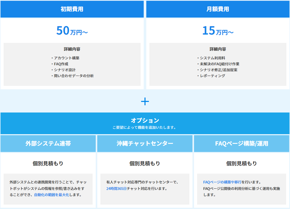 初期費用は50万円~、月額費用は15万円~となっています。詳細はサイトをご覧ください。