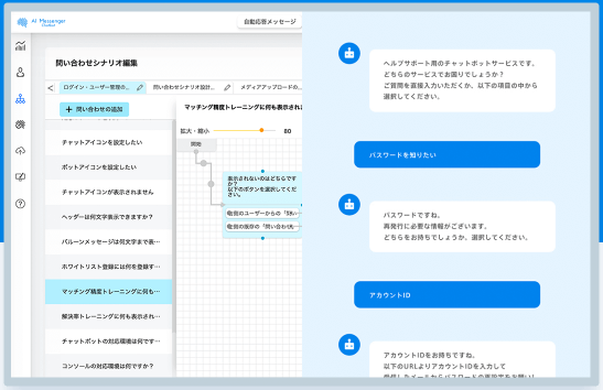 AI Messenger Chatbotは、AIチャットボット・有人チャットを活用しCS(カスタマーサポート)部門のお問い合わせ負担の軽減や業務効率化、顧客満足度向上を実現するサービスです。WEBはもちろんLINE公式アカウントでもご利用いただけます。