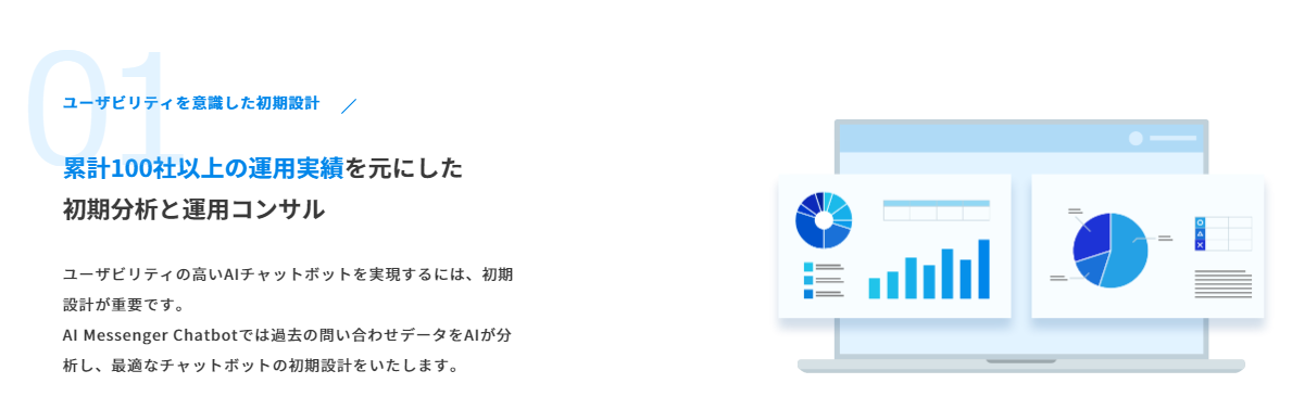AI Messenger Chatbotは、ユーザーの疑問解決にこだわった回答精度の高いAIチャットボットを提供します。ユーザビリティを意識した初期設計、回答精度を飛躍させるチューニング、成果に向き合うカスタマーサクセスなど、高品質なチャットボットを実現するための機能が用意されています。