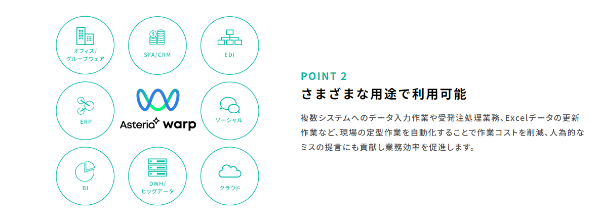 国内No.1のノーコードデータ連携ツール「ASTERIA Warp」の機能を厳選し、Excel・システムへのデータ入出力を自動化。簡単操作でデータ連携を実現。本格的な変換処理、連携テンプレート、スケジュール実行、既存システムを変えない連携、豊富な連携先、オンラインアップデートなどの特長がある。