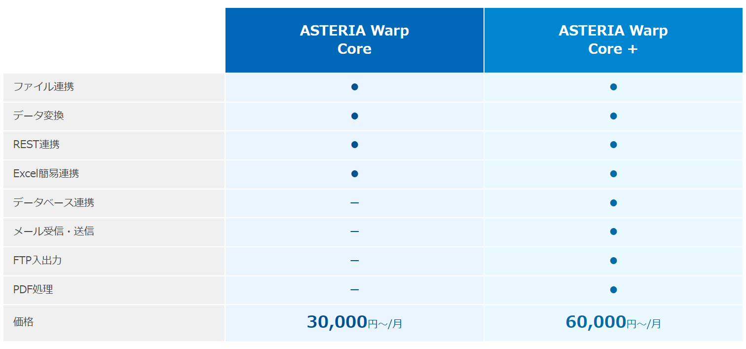 月額3万円から(ASTERIA Warp Core+は60,000円~/月)